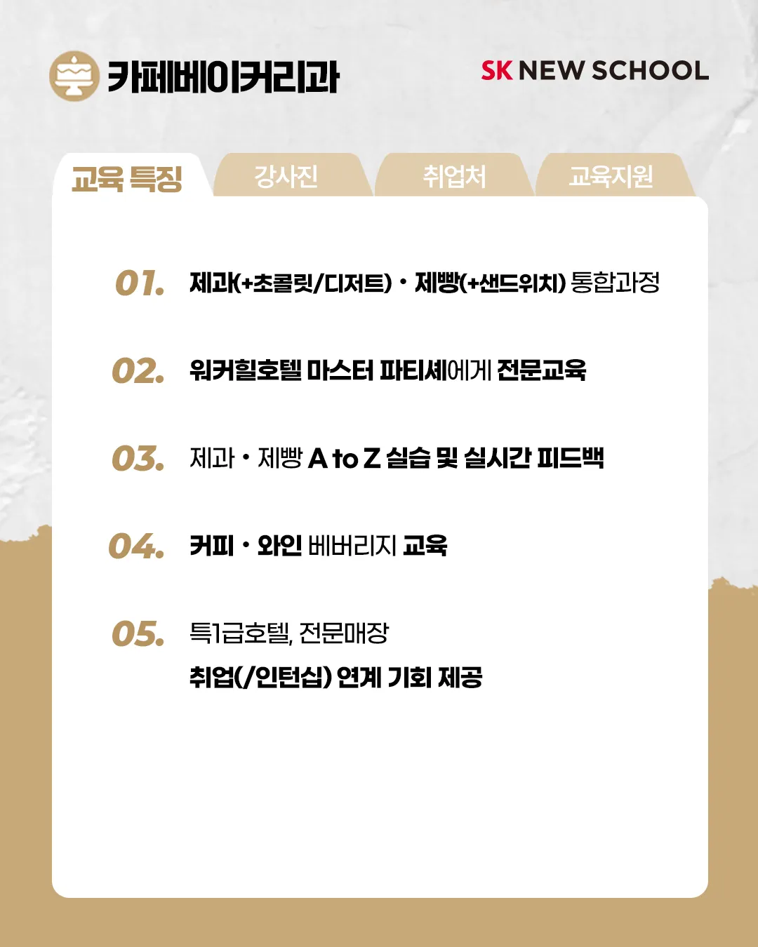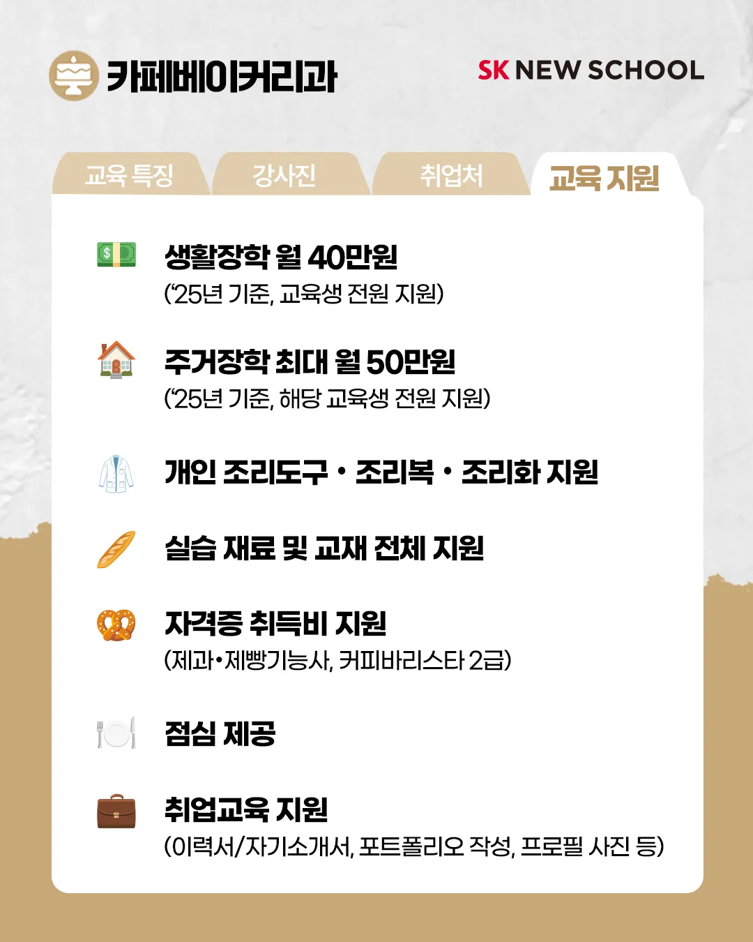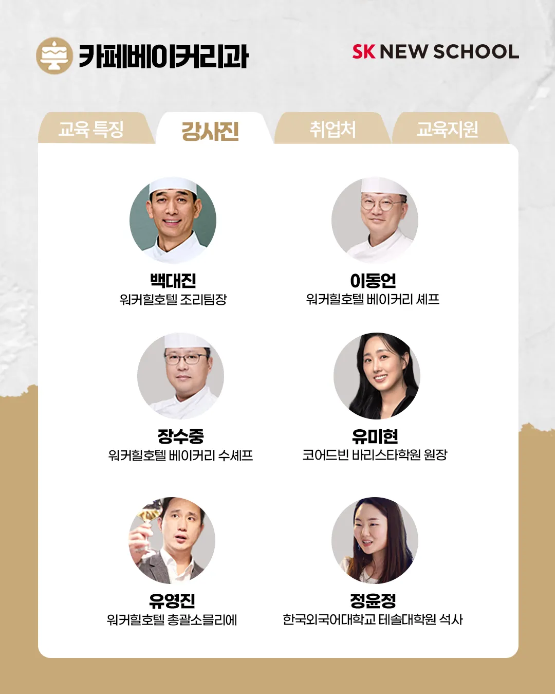 SK 뉴스쿨 | 직업을 배우는 진짜 학교 🏫 on Instagram: "🍰2024 SK 뉴스쿨 카페베이커리과 신입생 모집🍰 ⠀ 👉모집기간 2023.12.1~12.14 ⠀ 🍰카페베이커리과 교육 특징 1️⃣제빵(+샌드위치)과 제과(+디저트/초콜릿)를 함께 배우는 통합과정 2️⃣워커힐호텔 마스터 파티셰 3명에게 배우는 전문 교육 3️⃣호텔 판매 메뉴(재료 동일) 중심 심화 커리큘럼 운영 4️⃣역량강화를 위한 Beverage(커피/와인), 매니지먼트, 영어 교육 6️⃣개인별 실습 및 실시간 피드백, 하루 7시간 실습 ---- 👉 교육 강점 ✅교육비 전액 무료 (학비ㆍ교육기자재ㆍ교재ㆍ실습물품ㆍ자격증 취득비 제공) ✅생활ㆍ주거 장학금 지원 ✅실무형 커리큘럼과 전문 강사진 ✅SK 관계사 및 기업 인턴십 기회 제공, 채용 우대 ✅진로상담 및 개인별 취업 지원 ('20~'22년 평균 취업률 96%) ⠀ 👉 생활/주거 장학 지원 조리과ㆍ카페베이커리과 : 교육생 전원 지원 MD과ㆍ정보보안과ㆍ자동차판금도장과 : 신청/선발 지원 ⠀ 👉 모집학과 (총 80명) 조리과 20명 카페베이커리과 20명 MD과 20명 정보보안과 10명 자동차판금도장과 10명 ⠀ 👉 지원자격 5개 학과 분야에 관심과 성장 의지가 있고, 취업을 희망하는 2030대 청년이라면 누구나 지원 가능! 무스펙 • 무경력 • 비전공자도 OK! ⠀ 조리과ㆍ카페베이커리과 : 1985년~2005년생 MD과ㆍ정보보안과ㆍ자동차판금도장과 : 1991년~2005년생 ⠀ 👉 자세한 사항이 궁금하다면? 인스타 링크트리 GO!"